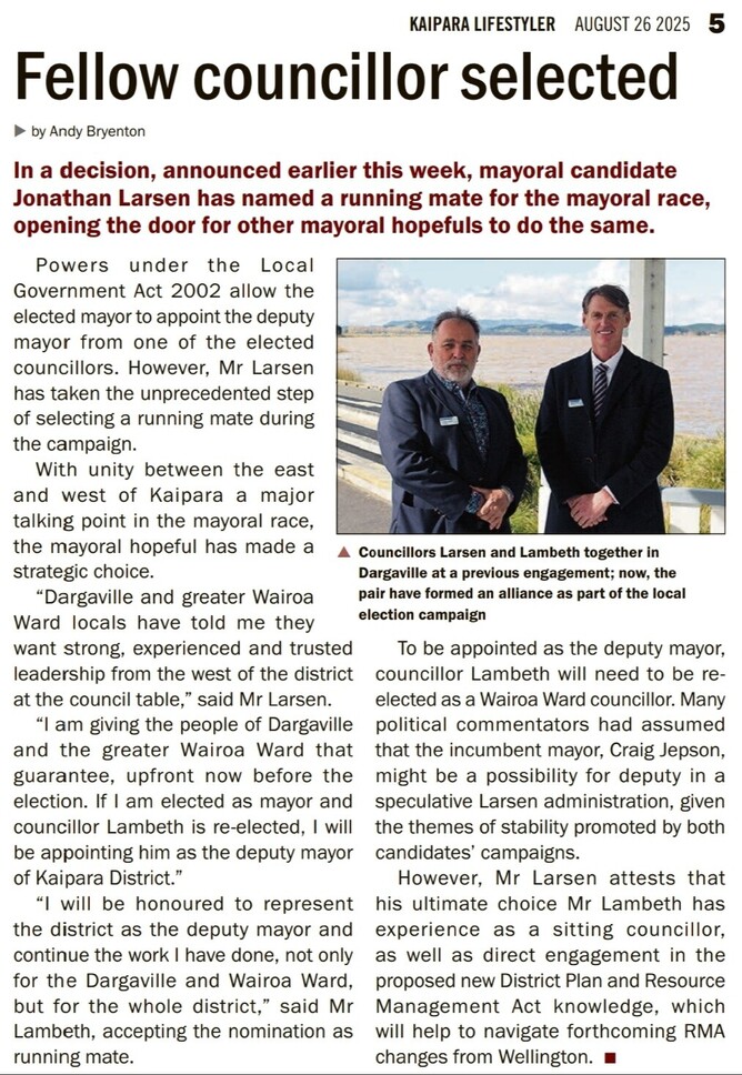 Kaipara needs leadership that brings people together. Gordon and I come from different parts of the district but share the same vision. We’ve already proven we work well together. This partnership will give Kaipara a strong, united and experienced leadership.